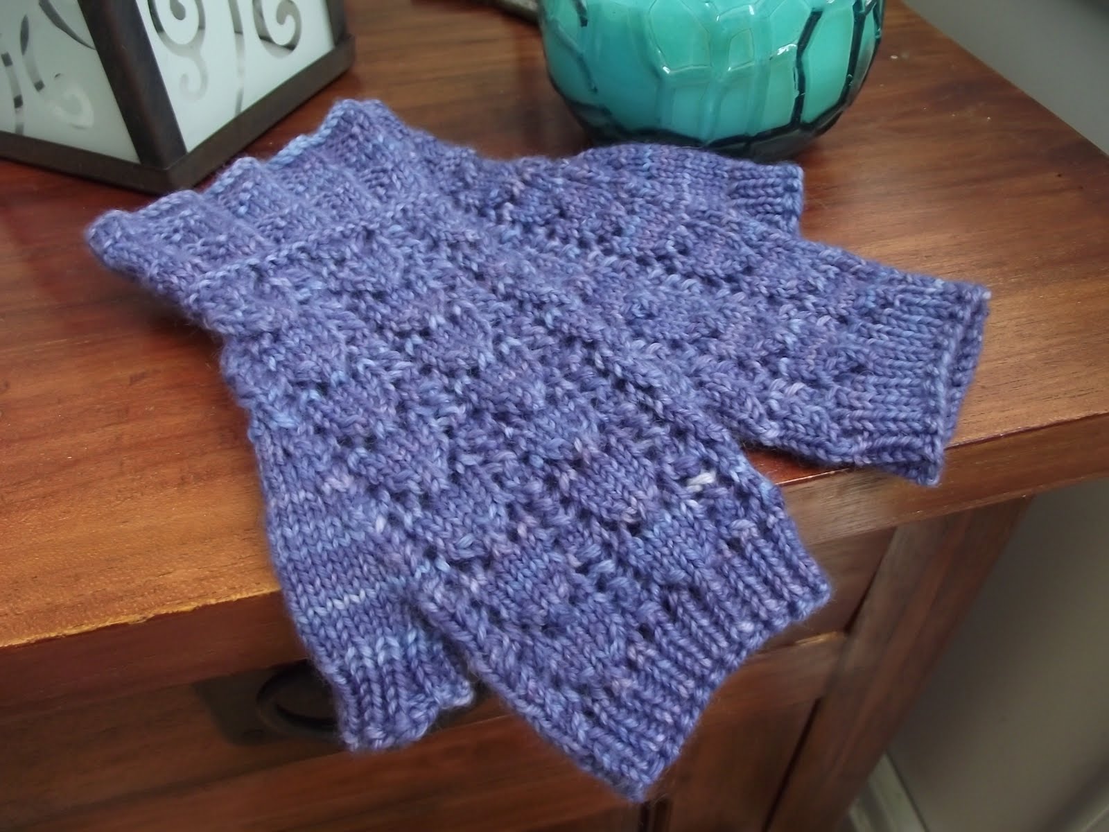 Very pretty. I want to make some of these myself one day, except I'll have to adjust the pattern for my teeny tiny hands. That and, while they're very pretty, I don't quit get the whole fingerless glove idea. It's my fingers that get the coldest.